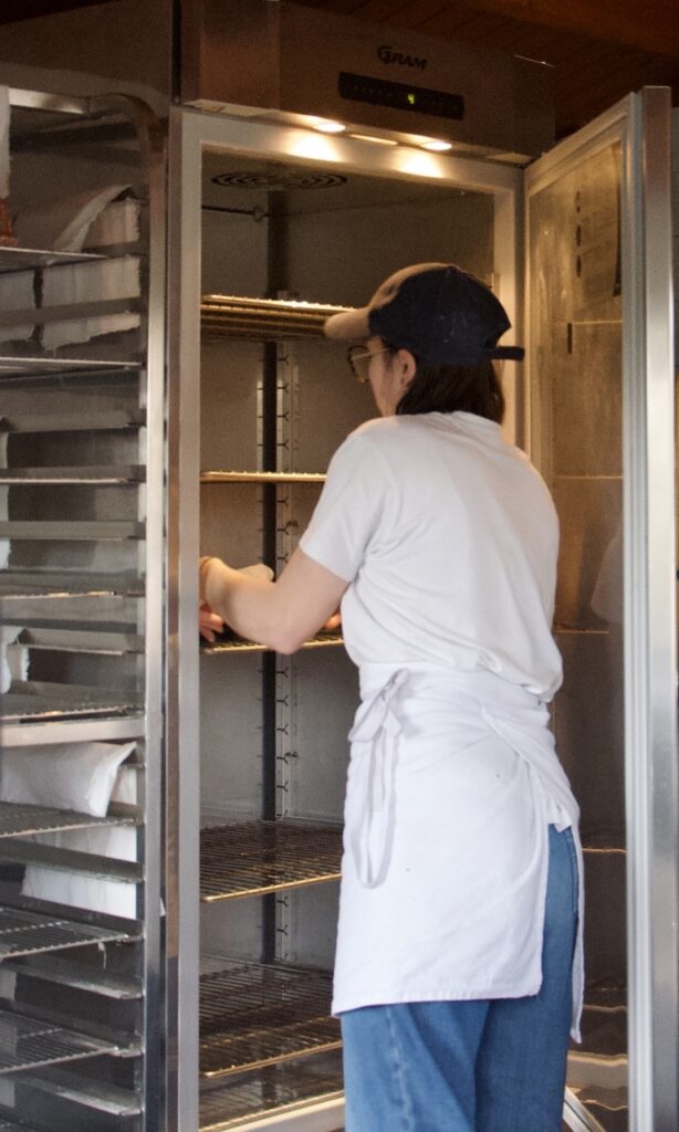 Le lundi, mercredi et jeudi elle pétrie et façonne à la main toutes les pâtes et s’occupe des autres préparations. Le mardi, jeudi et vendredi elle oscille entre cuisson, ouverture au fournil, livraison des commandes et vente chez Nicolas le maraîcher.