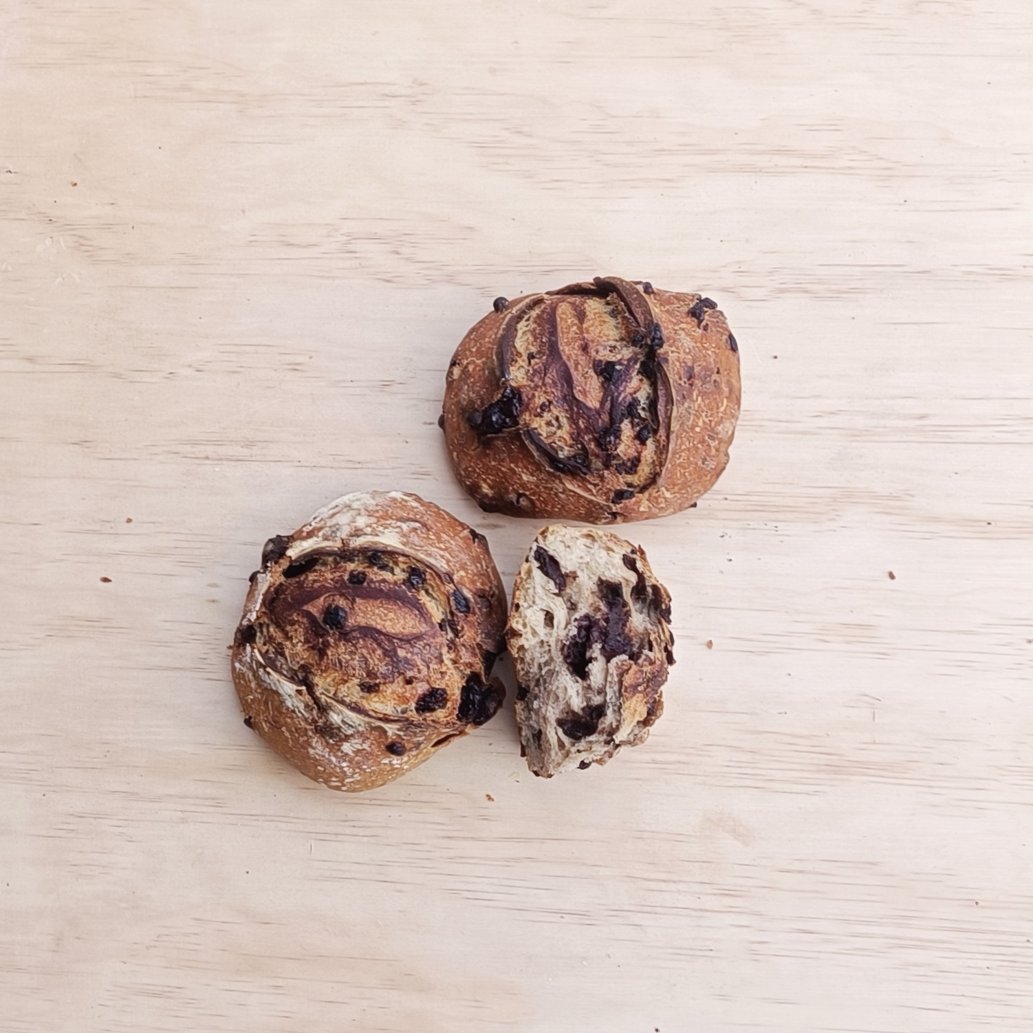 Farine BIO T110, T65, eau filtrée, levain naturel, chocolat, cacao en poudre, sel