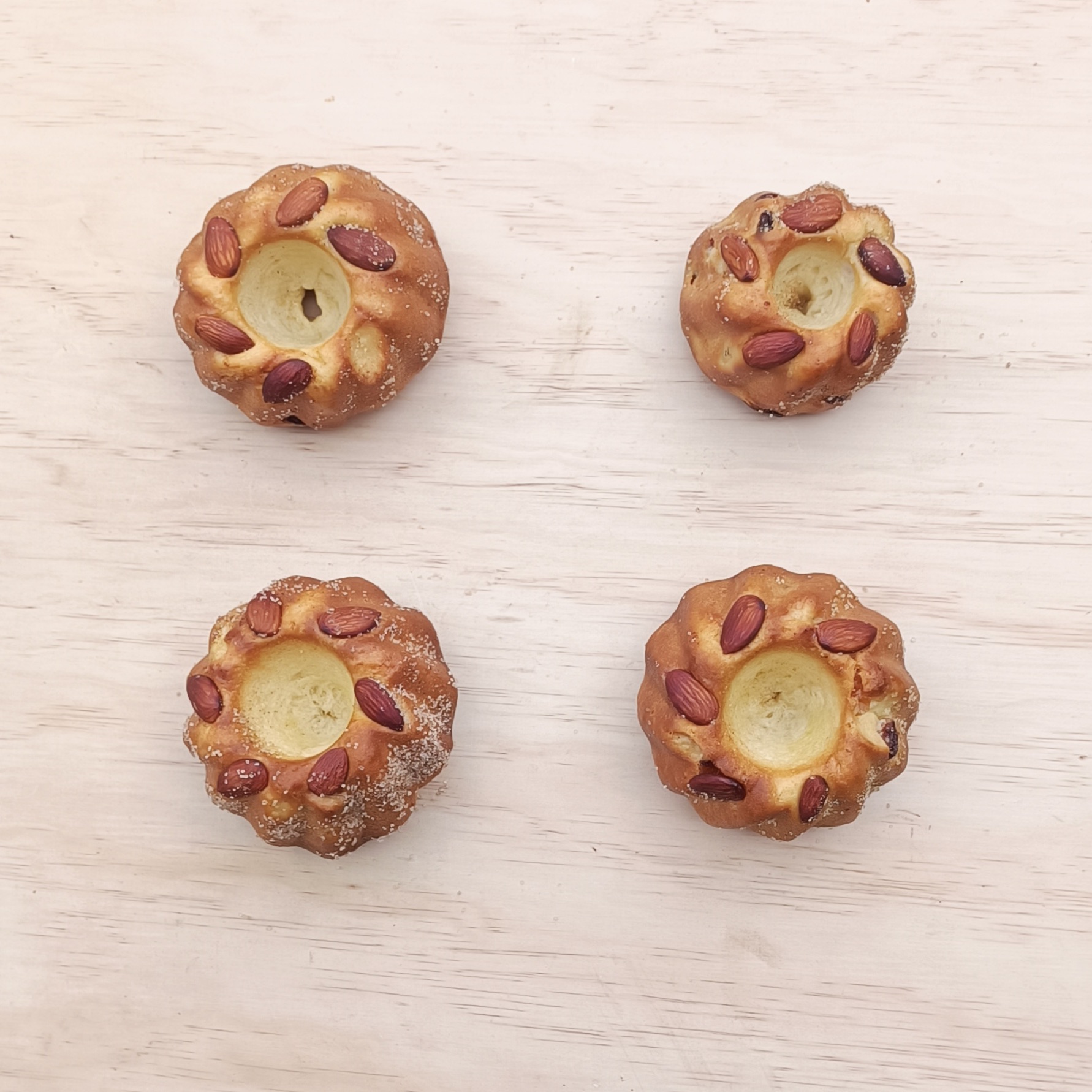 Farine BIO T65, lait, levain naturel, poudre d'amande, œufs, beurre, sucre, levure de boulanger, sel